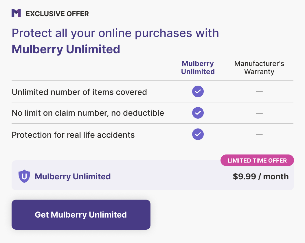 Mulberry offers a static image banner for the Mulberry Unlimited subscription that can be added anywhere within your HTML structure. Adding the image can be done by wrapping either of the image URLs in anchor tags and including your retailer_id as the utm_source in the href link. The full image will be clickable and redirect users to the Mulberry Unlimited landing page for signup.